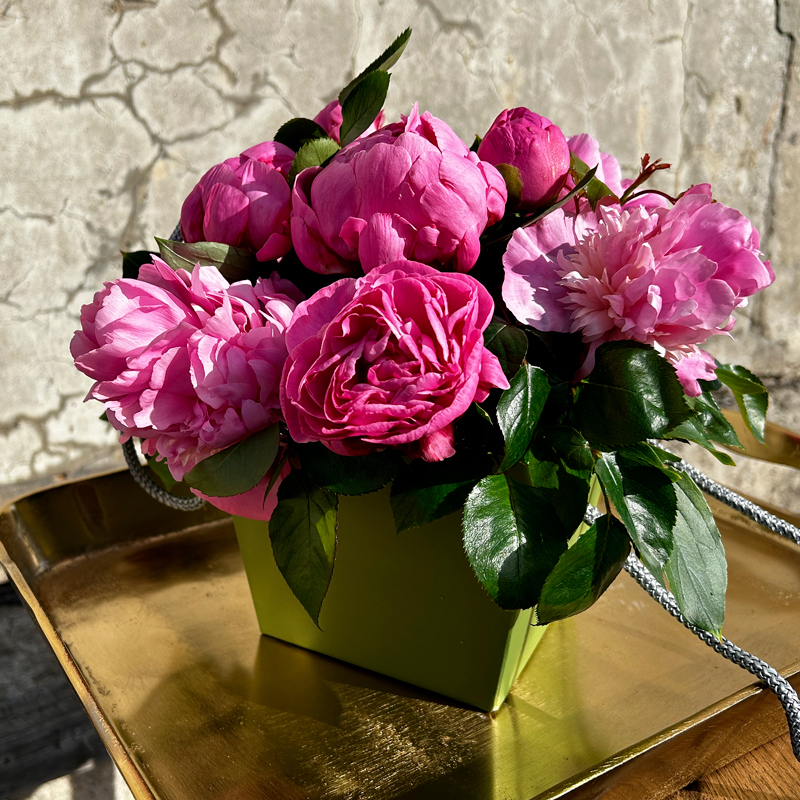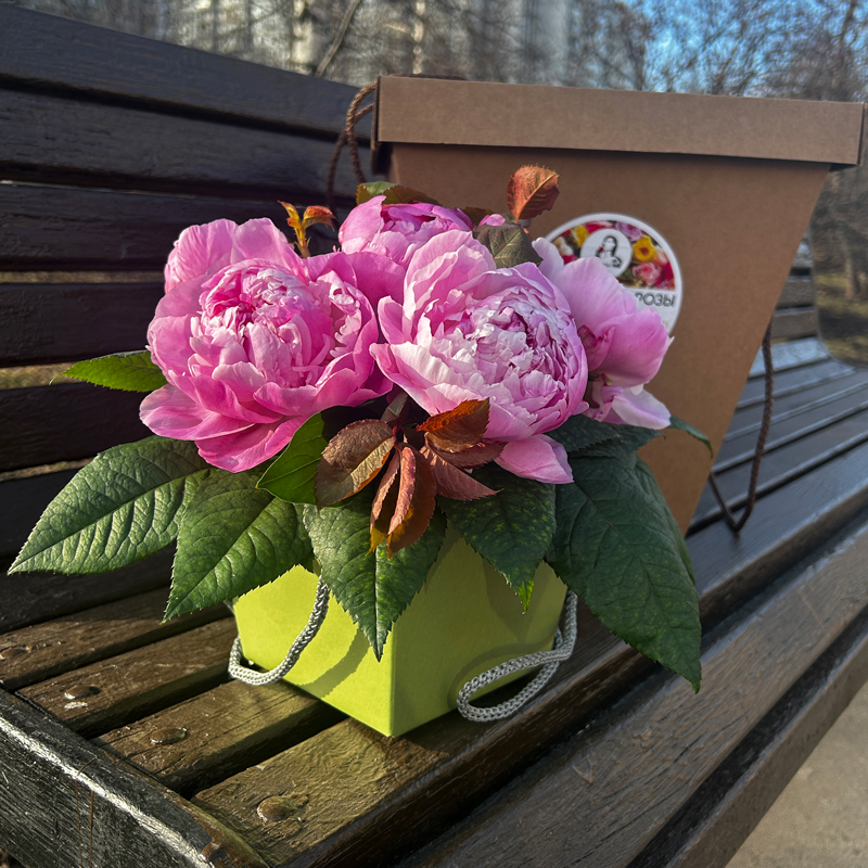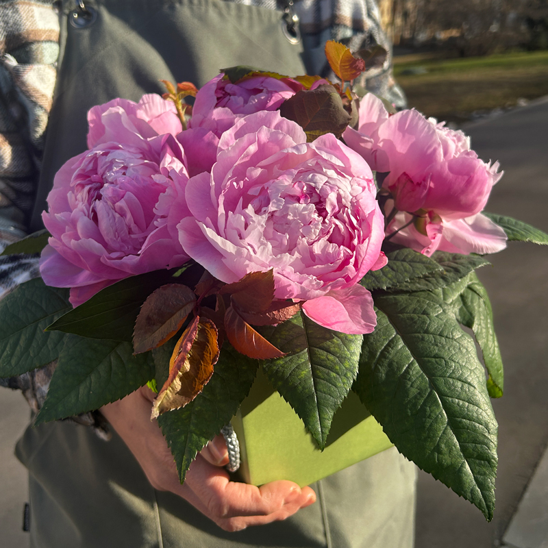 Состав композиции будет зависеть от срезки пионов. Могут быть ароматные сорта пионов, среди которых: Александр Флеминг, Сара Бернар, Месье Жюль Эли, Дюшес де Немур.