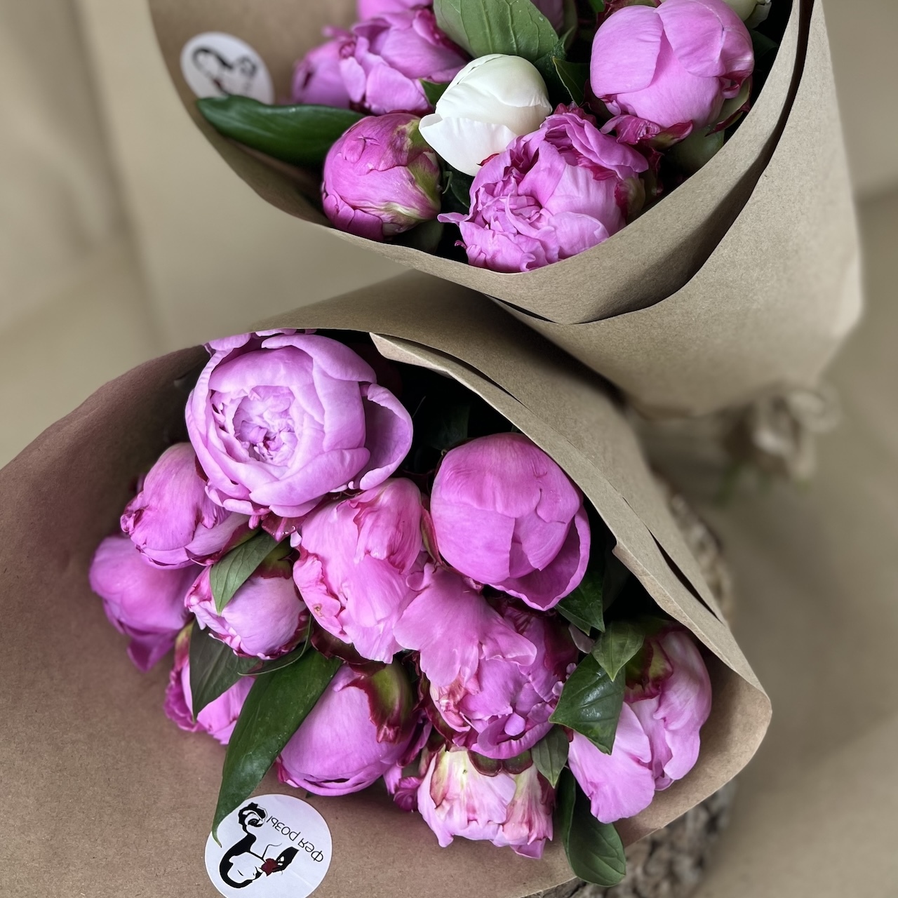 Состав охапки будет зависеть от срезки пионов. В охапке будут ароматные сорта пионов, среди которых: Александр Флеминг, Фестива Максима, Сара Бернар, Месье Жюль Эли, Дюшес де Немур.