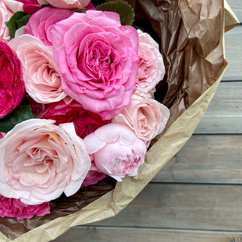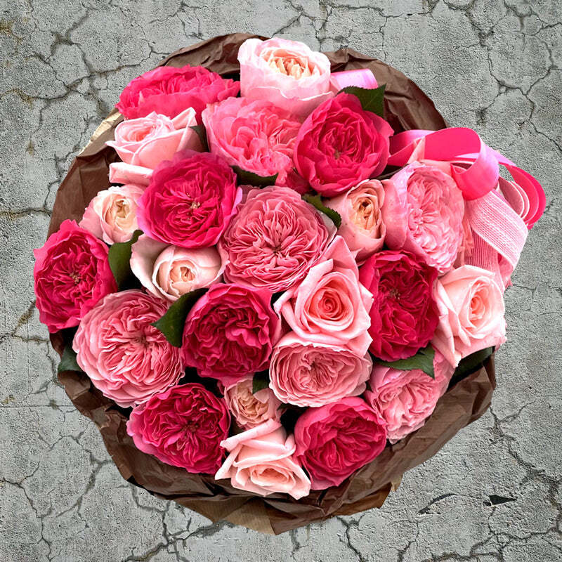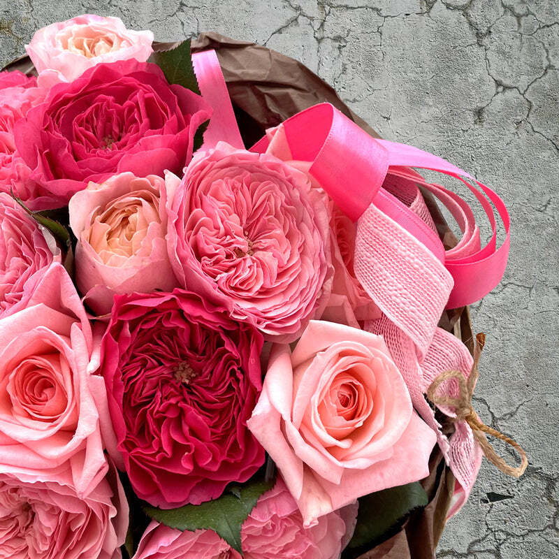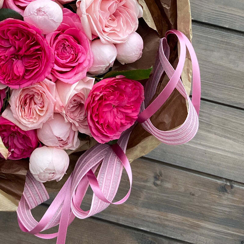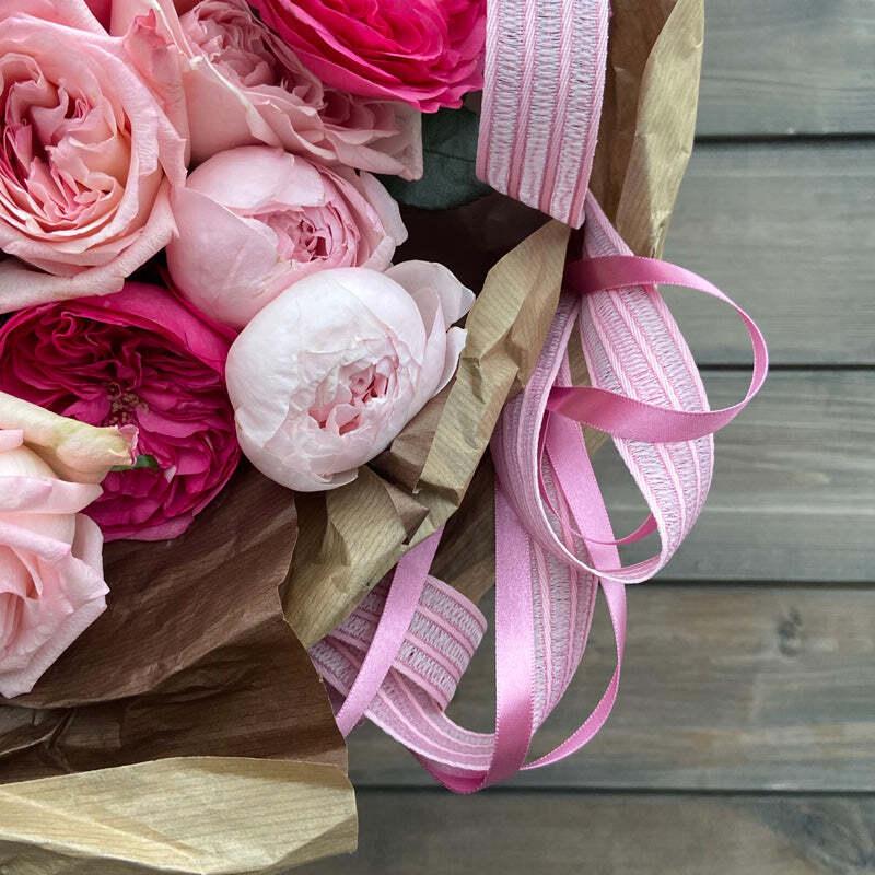 Роза — цветок, как будто специально созданный для объяснения в любви. Букет из множества оттенков розовых цветов нашепчет любимой множество ласковых слов. А изящные ленты сохранятся воспоминанием о нежном признании, как закладки в любимых книгах, как приятный элемент декора.